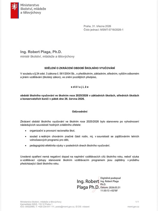 Vážení rodiče, školní rok bude končit v pátek 26. 6. 2026. Děkujeme za pochopení. Na fotografii je k dispozici sdělení ministra školství o změně konce školního roku 2025/2026.